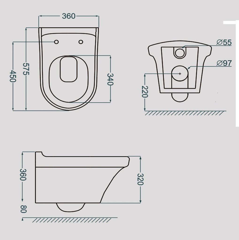 مشخصات ابعاد توالت فرنگی طول 57.5 عرض 36 ارتفاع 36 سانتی متر است. تحمل وزن تا 400 کیلوگرم
