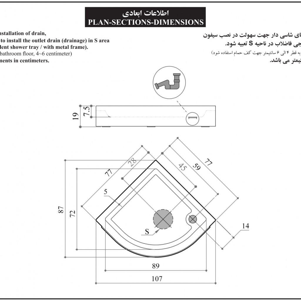 ابعاد زیر دوشی پرشین استاندارد مدل ملیسا 21*75*75 سانتیمتر با شکل ظاهری سه گوش است.