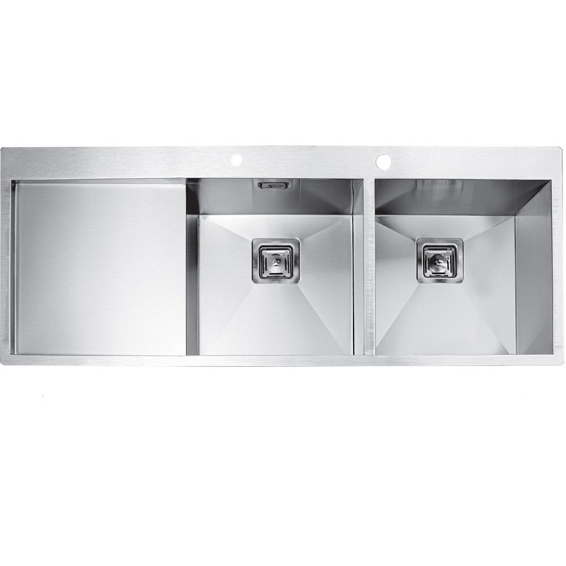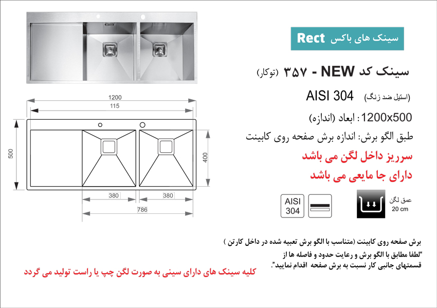 جنس سینک توکار اخوان مدل 357 استیل ساده با ضخامت 1 میلی متر در ابعاد 50*120 سانتی متر، دارای دو لگن به عمق 20 سانتی متر بصورت تک سینی