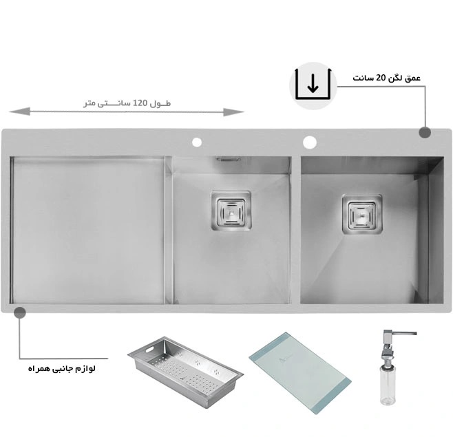 لوازم جانبی همراه سینک شامل جا مایع ، سبد استیل ، تخته گوشت شیشه ای و سیفون