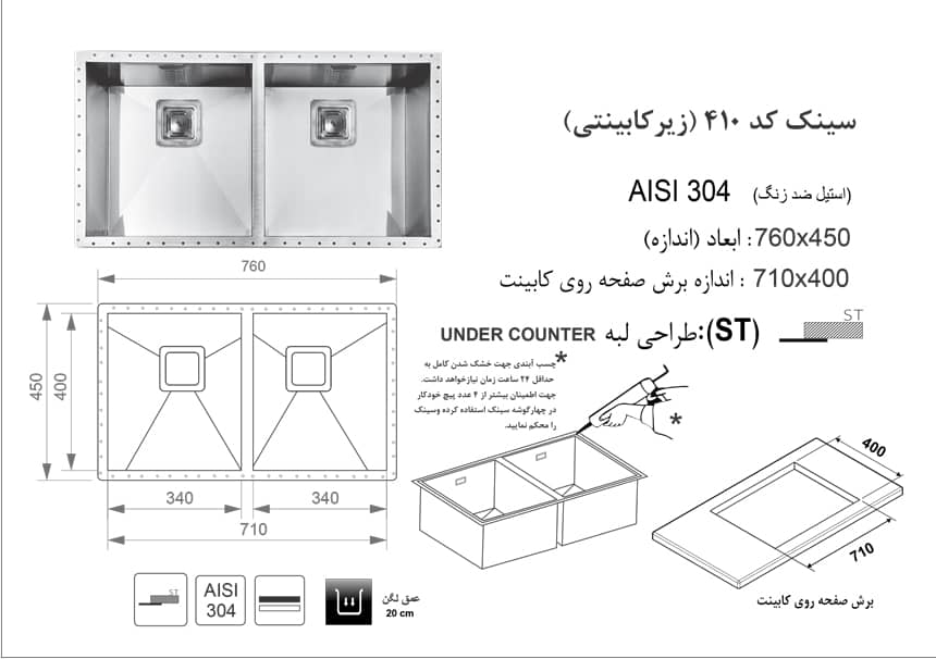 جنس سینک اخوان مدل 412 استیل 304 ضد زنگ با ضخامت 1 میلی متر در ابعاد 40*70.5 سانتی متر دارای دولگن به عمق 20 سانتی متر به همراه زیر آب های مربعی شکل