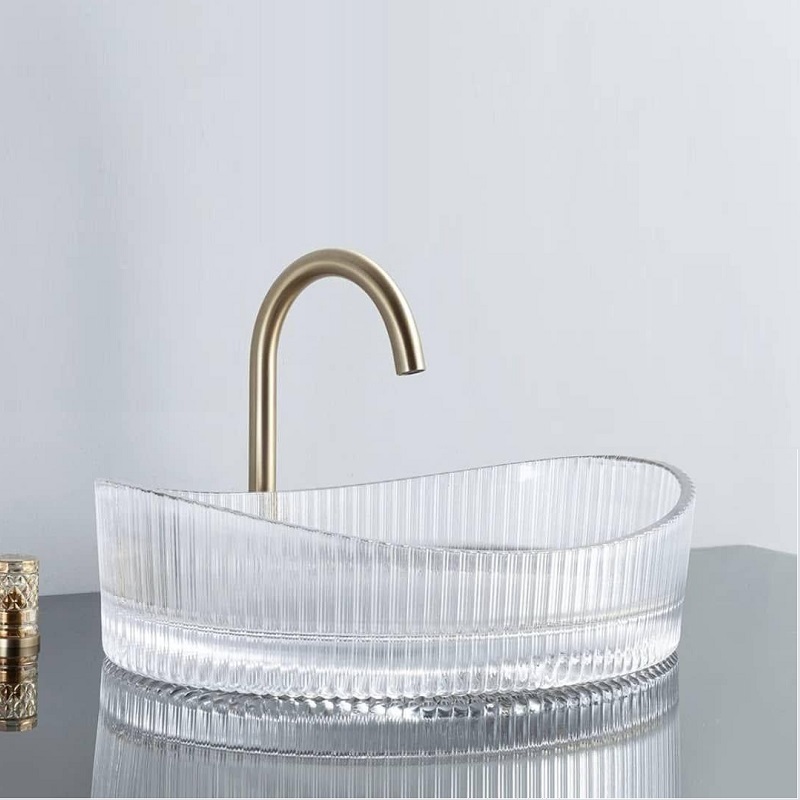 کاسه روشویی کریستالی وارداتی بیضی شیاردار از جنس شیشه کریستال مقاوم در برابر سرما و گرمای محیط به رنگ شیشه شفاف می باشد.