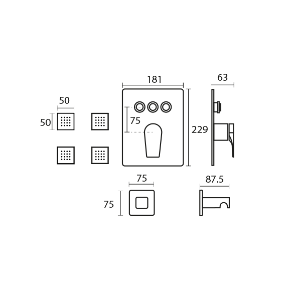 - پنل اصلی ریختهگری شده با دو جای دایورتور دکمه ای ( دایورتور» (Diverter) در شیرآلات توکار، قطعهایه که وظیفه تغییر مسیر جریان آب رو بین خروجیهای مختلف بر عهده دارد)